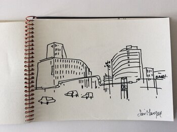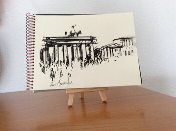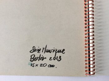 Diese Arbeit besteht aus 19 Zeichnungen, die mit einem Permanentmarker in einem Notizbuch mit Pappdeckel und verschiedenen Papieren angefertigt wurden. Sie werden auf einer 13 cm hohen Holzstaffelei präsentiert. Hoch. Öffnen Sie das Notizbuch und legen Sie an erster Stelle die Zeichnung ab, die Sie jederzeit problemlos in eine andere Zeichnung ändern können. Die Blätter können einzeln oder das gesamte Notizbuch mit einem Kastenrahmen gerahmt werden.… Kataloge der verschiedenen Ausstellungen werden verschickt