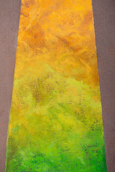La Hiedra entführt uns in eine Welt, in der Natur und Geschichte in einem fesselnden chromatischen Tanz zusammenfließen. Links von der Komposition steht ein Obelisk, dessen Figur sich allmählich aus einer Palette von Blautönen erhebt, die in warme Gelbtöne übergehen und den Übergang vom Tag zur Nacht heraufbeschwören. Auf der rechten Seite erscheint als Kontrapunkt der Kopf von Dionysos, dem Gott des Weins und der Fruchtbarkeit, umrahmt von üppiger… Efeuvegetation. Der Kopf löst sich sanft in den Gold- und Ockertönen der umgebenden Flora auf. Der Efeu verschmilzt in seinem beharrlichen Vordringen mit der Geschichte und schafft eine immaterielle Verbindung zwischen Vergangenheit und Gegenwart. Der Raum zwischen diesen beiden ikonischen Darstellungen ist mit kleinen Farbquadraten übersät, die wie Pixel in der Luft schweben und so die chromatische Ausrichtung der beiden Hauptelemente beibehalten. Diese Farbfragmente verleihen dem Werk eine zeitgenössische Note.