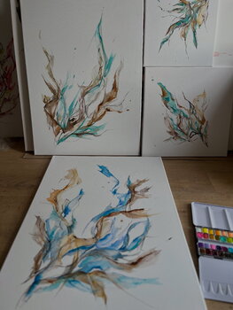 In diesem Werk habe ich die Leichtigkeit des Moments eingefangen, wie Farben sanft ineinander fließen und sich ganz natürlich entfalten. Mit Aquarell und Bleistift wollte ich eine flüchtige, fast träumerische Stimmung schaffen, die Ruhe und Bewegung zugleich vermittelt. Die Energie dieses Bildes bringt Leichtigkeit und tiefe Harmonie in jeden Raum, in dem es hängt. Es lädt ein zum Innehalten und Träumen.