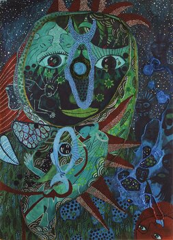 Im Mittelpunkt steht der große Geist – Sinnbild für die Verbundenheit allen Lebens.… Pflanzen, Tiere, Menschen und Sterne fließen ineinander, werden eins im Spiel der Farben, Linien und Symbole.