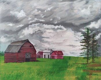 Ich habe mein ganzes Herzblut in die Einfangenung der rauen Schönheit eines unruhigen Himmels über bescheidenen Scheunen gesteckt und dabei mit Acrylfarben Realismus mit Emotion verbunden. Dieses Gemälde pulsiert mit der Energie bevorstehender Veränderungen und weckt Ruhe und Vorfreude zugleich. Wenn Sie es in Ihr Zuhause holen, wird es den Raum mit einer gefühlvollen Verbindung zur Kraft der Natur und ruhigen Momenten am Rande eines Sturms erfüllen.