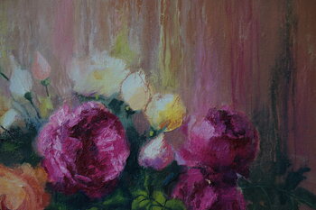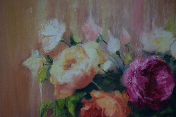 Bei der Gestaltung dieses Gemäldes habe ich meine Gefühle in jeden Pinselstrich einfließen lassen und die Ausdrucksqualitäten des Impressionismus mit der feinen Präzision des Realismus vermischt. Diese Verschmelzung schafft eine lebendige Interpretation von Gartenrosen, ihren üppigen Blütenblättern und sanften Farbtönen vor einem warmen Hintergrund, der die vergängliche Schönheit des Lebens symbolisiert. Ich stelle mir vor, dass dieses Stück einen… Anflug von Inspiration und eine sanfte Erinnerung an die vergängliche Pracht der Natur in Ihr Zuhause bringt und mit seinen lebendigen Farben und seiner dynamischen Textur jedem Raum Energie verleiht.
