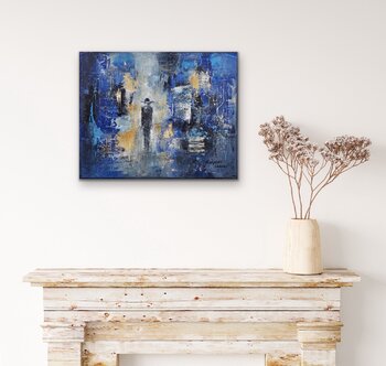 Manche Dinge sollen einfach so sein. Wenn es nicht so aussieht, geben Sie ihm Zeit. Man weiß nie, was vor der Tür steht. Ein entzückendes Kunstwerk in Blau. Attraktive Textur, wobei die Szene die Ränder der Leinwand bedeckt. Das Gemälde ist fertig zum Aufhängen. Es ist kein Rahmen erforderlich. Dieses Original-Ölgemälde wird mit einem vom Künstler unterzeichneten Echtheitszertifikat geliefert.