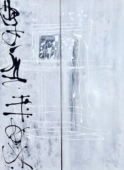 Das Wichtigste für mich war, das Gemälde gleichzeitig energetisch und meditativ zu gestalten. Ich weiß, das klingt widersprüchlich, nicht… wahr? Ich habe die Dekalkomanie-Technik und verschiedene Öl- und Acrylfarben verwendet, was anspruchsvoller war als erwartet. Es ist eine Kombination aus Öl- und Acrylmalerei und vielen ungewöhnlichen Medien. Da ich ein echter Japan-Fan bin, musste ich einen japanischen Akzent einarbeiten, und wie Sie sehen, ist mir das gelungen. Arigato.