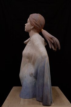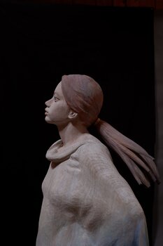 Mit dieser Skulptur wollte ich ein Gefühl von Freiheit und innerer Ruhe ausdrücken, wie beim Schweben durch den Nachthimmel. Die in fließende Gewänder gehüllte Figur verkörpert einen ruhigen, aber grenzenlosen Geist, der Stille und Bewegung zugleich umfasst. Die natürliche Maserung des Holzes unterstreicht die organische Weichheit der Form und ruft eine meditative Präsenz hervor. Dieses Werk lädt den Betrachter ein, in einen Moment der Gelassenheit… einzutauchen und erinnert ihn sanft an die stille Kraft, die in der Freiheit des Denkens und der Vorstellungskraft liegt.
