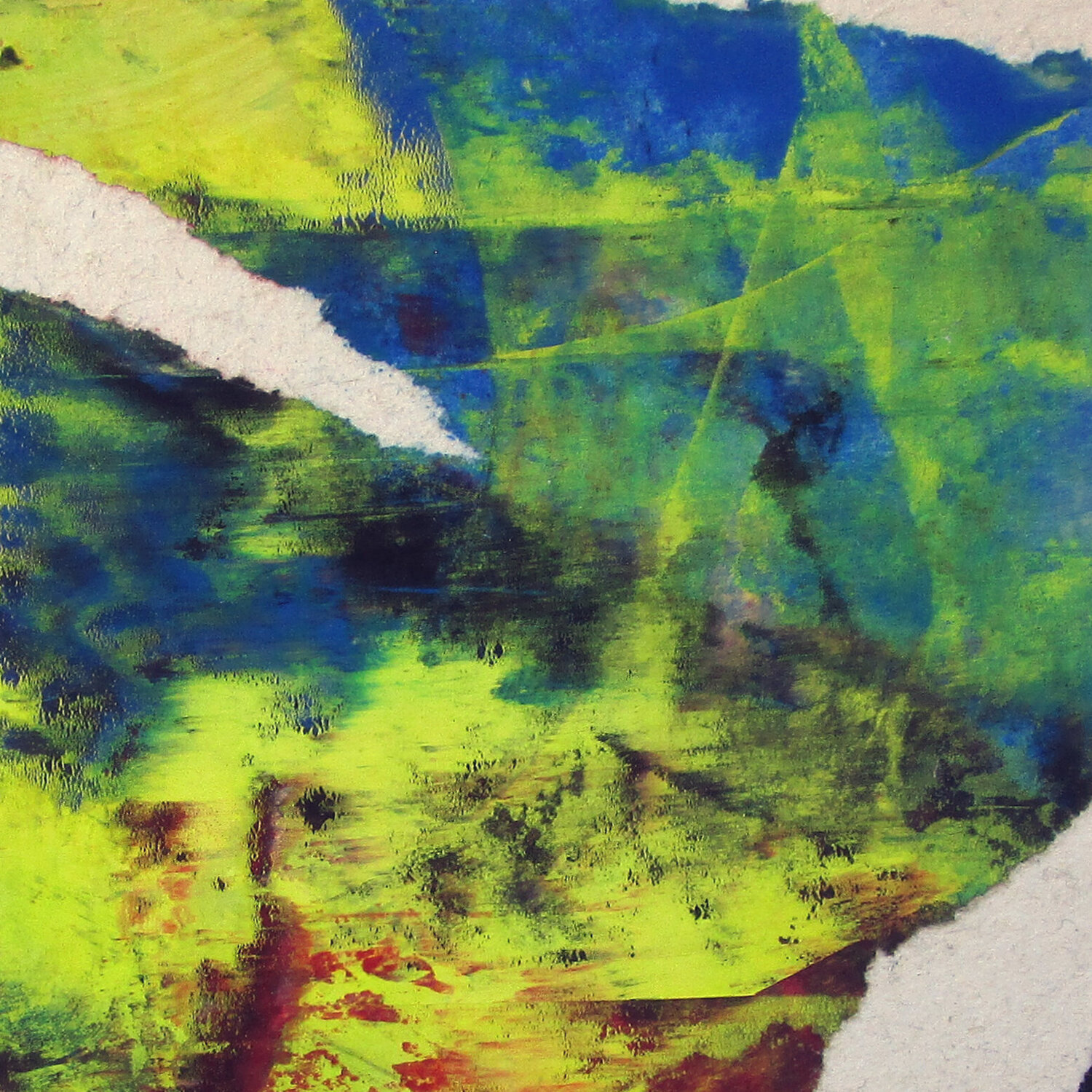 Erfahrungen 5 - kleine 12 x 12 cm Papierarbeit / 6-teilige Reihe. Beschäftigung mit den Erfahrungen in unserem bunten Leben. Ausbrüche, die ich durch Schäden am Papier darstelle. Dinge, an denen wir wachsen und die zu unserem Dasein gehören, ein Gesamtbild ergeben, das stimmig ist.
