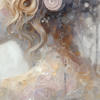 „Souffle d'Ivoire“** ist ein zartes Werk, das Weichheit und Leichtigkeit in einer Harmonie aus Elfenbein-, Creme- und Lavendeltönen einfängt. Das in wohltuendes Licht getauchte weibliche Gesicht scheint zwischen Traum und Wirklichkeit zu schweben. Seine luftigen Locken mit den zart geformten Kurven erinnern an den Wind, der ein Meer aus Seide streichelt. Die scrollenden Texturen verleihen einen Hauch zeitloser Eleganz und verstärken den Effekt der…
