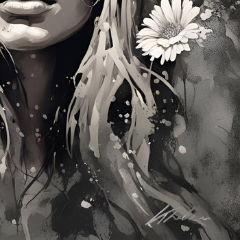 Dieses Kunstwerk fängt die Harmonie zwischen innerer Gelassenheit und der rohen Kraft der Natur ein. Das mit zarten Blumen und organischen Texturen geschmückte Schwarz-Weiß-Porträt ruft eine subtile Dualität zwischen Zerbrechlichkeit und Stärke hervor. Sanfte Kontraste und künstlerische Spritzer sorgen für visuelle Tiefe und verstärken die Emotion und Zeitlosigkeit des Werkes. Diese Kreation lädt zum Nachdenken ein, symbolisiert eine tiefe Verbundenheit…