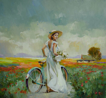 Auf diesem Ölgemälde habe ich einen Moment ruhiger Schönheit festgehalten, als eine Frau, geschmückt mit einem fließenden Kleid, sich inmitten einer leuchtenden Blumenwiese anmutig an ein Vintage-Fahrrad lehnt. Die fernen Sturmwolken kontrastieren mit den sonnenbeschienenen Blüten und rufen ein Gefühl stiller Stärke angesichts der flüchtigen Stürme des Lebens hervor. Jeder Pinselstrich ist ein Beweis für die Widerstandskraft des Geistes und die Freude… an den einfachen Freuden des Lebens. Dieses Gemälde ist eine Verkörperung von Gelassenheit und Anmut, die jedem Raum Wärme und Inspiration verleiht.