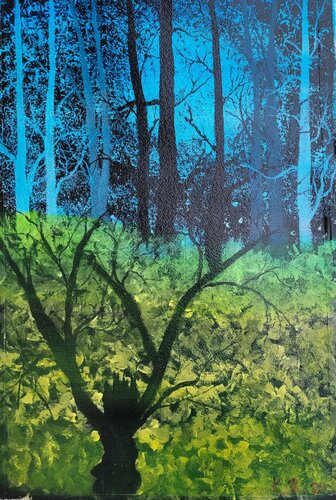In diesem Kunstwerk wollte ich das bezaubernde Zusammenspiel von Licht und Schatten in einem Wald mit Acryl und Öl auf Papier einfangen. Das leuchtend grüne Laub hebt sich leuchtend vom geheimnisvollen blauen Hintergrund ab und erzeugt einen lebhaften Kontrast, der die anhaltende Vitalität und Vielfalt der Natur symbolisiert. Dieses Stück ist eine Hommage an die Widerstandsfähigkeit und Schönheit der Natur und soll ein Gefühl der Ruhe und Ehrfurcht… in jeden Raum bringen.