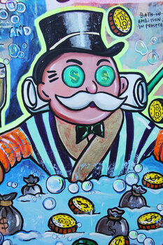 "Spa of Success." -t his colorful pop art painting envisions Mr. Monopoly in pure ecstasy, relaxing in a fancy bathtub packed with gold coins, Bitcoin and cash. Sporting cucumber slices over his eyes and a glass of champagne, he’s embracing the good life — where financial success meets total zen.