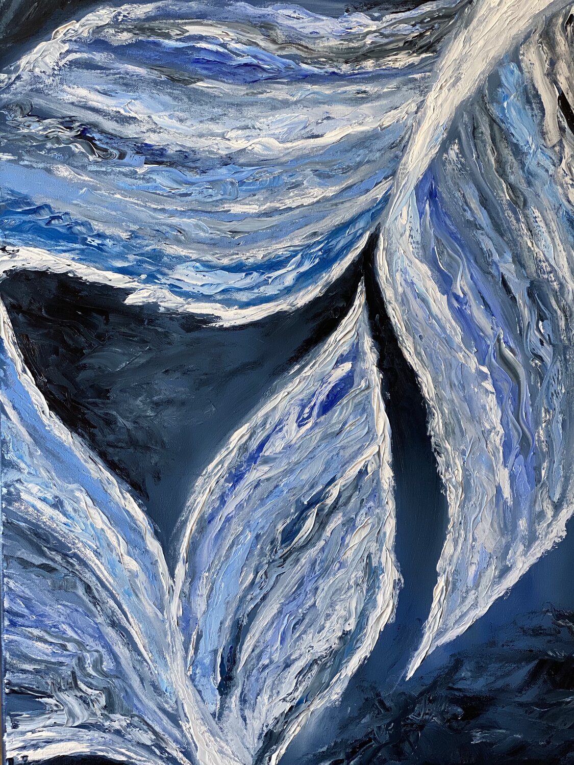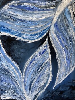 In diesem Gemälde habe ich das bezaubernde Mysterium der Unterwasserwelt eingefangen. Die dynamischen Striche und strukturierten Schichten in Blau, Marineblau und Weiß erzeugen eine stilvolle Abstraktion, die an die Bewegung von Meereswellen erinnert. Inspiriert von der Anmut der Natur ähneln die Formen den Schwänzen von Walen, Delfinen und Fischen, die elegant durch das tiefe Wasser schneiden.