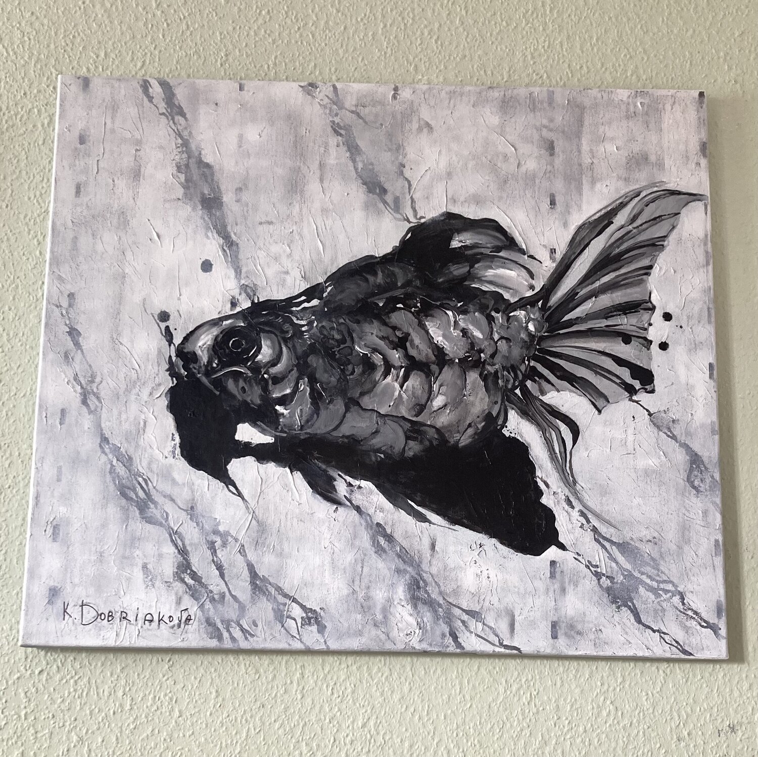In diesem Werk habe ich mit Acryl abstrakte und metaphysische Elemente vereint, um die schlichte, aber kraftvolle Symbolik des Fisches zu erfassen. Mit minimalistischem Stil wollte ich Ruhe und Tiefgründigkeit schaffen, die zugleich eine geheimnisvolle Energie ausstrahlt. Dieses Bild bringt eine meditative Atmosphäre in dein Zuhause und lädt dich ein, die verborgenen Tiefen des Lebens zu erforschen.