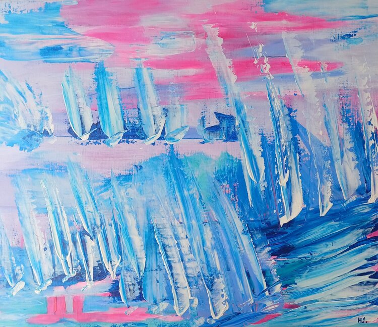 In dieser Arbeit wollte ich die lebendige und vergängliche Essenz einer Regatta einfangen. Ich habe Acrylfarben aufgrund ihrer leuchtenden Töne und der schnellen Trocknungszeit verwendet und mich für einen halbabstrakten Stil entschieden, um der Fantasie freien Lauf zu lassen und die Formen mit meiner Fantasie zu kombinieren. Dieses Gemälde erinnert an die fließende Bewegung von Segeln im Wind, im Kontrast zu einem leuchtend roten Himmel, der Leidenschaft… und Tiefe weckt. Jeder Pinselstrich und jedes Spachtelmesser ist eine Einladung, die Freiheit und Energie des Meeres zu spüren. Hängen Sie dieses Gemälde in Ihr Zuhause, um einen Hauch von Dynamik und täglicher Inspiration zu bringen.