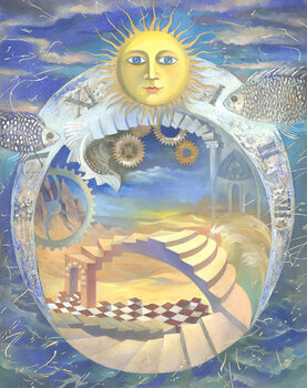 Wir leben in einer Zeit der Veränderungen. Die Ära der Fische ist vorbei. An seine Stelle tritt ein neues Konzept – das Zeitalter des Wassermanns. Sie muss die Lehren dominieren und die Synthese verschiedener Glaubensbekenntnisse und moderner wissenschaftlicher Errungenschaften darstellen. Das Gemälde symbolisiert den Übergang einer Epoche von einer zur anderen.