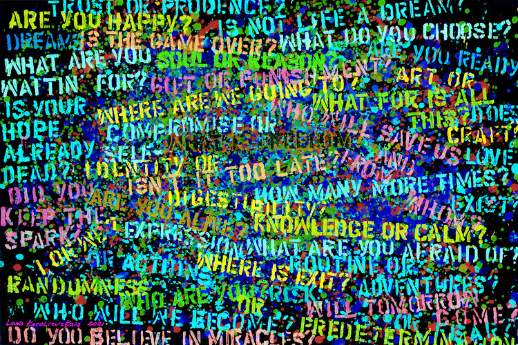 Es gibt solche Fragen im Leben, die sich jeder Mensch früher oder später stellt. Sie sind vielseitig. Ich beschloss, diese Fragen durch meine Kunst zu ziehen. Ich wollte die Wirkung von Street Art erreichen, als wäre es kein Gemälde, sondern eine Wand, die die Autoren durch eine Schablone dicht mit verschiedenen Phrasen beklebten. Es mag den Anschein haben, dass die Fragen zufällig sind, aber sie sind eng miteinander verbunden und können sich gegenseitig… generieren. Jeder sucht selbst nach Antworten darauf, lebt sein Leben.