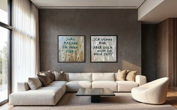 Als Paar entfalten die Werke eine besondere Spannung im Zusammenspiel von Text und Raum. Gleichzeitig funktionieren sie auch einzeln als eigenständige Arbeiten mit starkem Wiedererkennungswert.