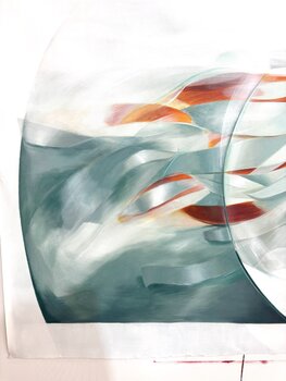 In diesem Gemälde wollte ich die fließende und ätherische Anmut der Bewegung einfangen. Die sanften Schwünge in kühlen Grün- und Weißtönen bilden einen flüsternden Hintergrund, vor dem leuchtend orangefarbene Striche tanzen und an Blätter oder Glut in einer sanften Böe erinnern. Es ist ein Werk der Ruhe und doch der Bewegung, das den Betrachter in einen Moment zwischen Veränderung und Stille entführt. Dieses Gemälde entstand aus dem Wunsch, die Schönheit… der Vergänglichkeit und den unaufhörlichen Fluss des Lebens zu vermitteln. Es eignet sich perfekt, um jedem Raum ein Gefühl ruhiger Dynamik zu verleihen.