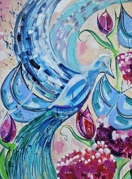Ein leuchtend blauer Vogel schlängelt sich anmutig durch abstrakte Blumenmuster mit kräftigen roten Blüten und üppigen grünen Stielen. Die dynamische Komposition zeichnet sich durch Spritzer und Wirbel aus und erzeugt ein Gefühl von Bewegung und Energie.