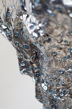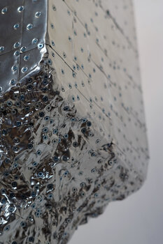 Diese Arbeit hat eine innere Struktur aus Holz, auf die nachträglich Aluminiumbleche geschraubt wurden. In seiner zweiten Arbeit der Serie versuchte der Künstler, den Erosionsprozess zu simulieren, durch den Wind und Wasser das Gestein formen. Auch in diesem Fall, wie in jedem Werk dieser Serie, erschafft Lele De Bonis ein stilistisches Spiel, indem sie nichts anderes als eine „Montage“ in einen gefälschten, geschnitzten und unfertigen Stein verwandelt.… In dieser Arbeit hat der Künstler neben der Darstellung des Zeitablaufs in natürlichen Prozessen versucht, parallel dazu auch die menschliche Natur darzustellen, mit der Zeit in ständiger Veränderung. Erosion ist also nicht nur ein physisches, sondern auch ein psychologisches Problem. Wie viele Dinge des Alltags prägen, zerreißen, erodieren uns im Innern unserer Seele?
