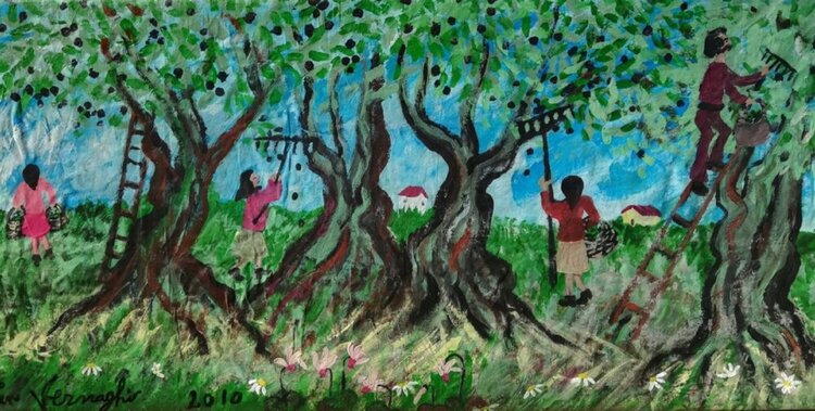 In meiner Arbeit habe ich versucht, die lebendige und freudige Energie der Olivenernte einzufangen. Mit Acrylfarben und Gouache habe ich Strichmännchen und robuste Bäume gemalt, um ein Gemeinschaftsgefühl und eine Verbindung zur Natur hervorzurufen. Jeder Pinselstrich drückt Tradition und Zusammenarbeit aus und bringt einen Geist der Harmonie und Einfachheit in Ihr Zuhause.