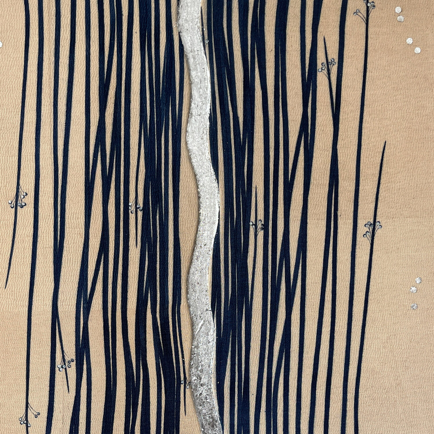 Das Stück greift auf das traditionelle japanische Konzept des „Kintsugi“ zurück – es… „vereint“ die Teile eines antiken Obi mit Silberblatt wieder zusammen, um ihm als Kunstwerk neues Leben einzuhauchen.