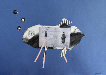 Ein Hybridfisch trägt auf dem Rücken ein ausgeschnittenes sowjetisches Inlandspassformular – teils Personalakte, teils bürokratisches Relikt. In seinem Inneren stehen zwei winzige Männer in langen Mänteln (klassische Beobachter jedes Überwachungsregimes), als wären sie in einem Aquarium eingeschlossen.