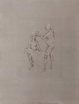 Kupferstich aus dem Werk „Der Rat der Liebe“ von Oskar Panizza. Es trägt den Trockenstempel der Unterschrift.