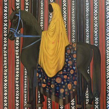 Auf dem ersten Gemälde sitzt eine verschleierte Frau aufrecht auf einem schwarzen Pferd. Ihr gelbes Tuch umhüllt sie mit stiller Autorität. Das Pferd wird so mehr als nur ein Tier; es symbolisiert Ausdauer und Kontinuität und spiegelt wider, wie die Frauen der Khaleeji-Region Traditionen bewahrt und sich in einer einst von Männern dominierten Welt ihren Platz erobert haben. Es zeugt vom kulturellen Erbe und der wichtigen, wenn auch oft unsichtbaren… Kraft der Frauen, die Familie, Kultur und Identität bewahrt haben.