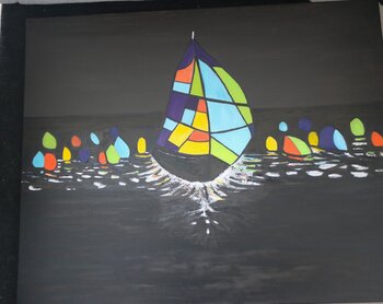 Ich wollte die majestätische und farbenfrohe Ankunft einer imaginären Regatta bei Nacht malen. Die Segelboote unter Spinnakern durchschneiden das Meer, und wir könnten meinen, sie kämen direkt auf uns zu, jenseits des Rahmens der Leinwand.