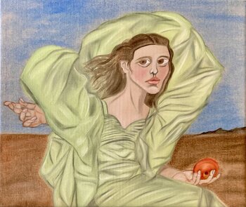 Dieses Gemälde zeigt eine junge Frau, die in einer kargen Landschaft zwischen hellem Himmel und ockerfarbener Erde sitzt, scheinbar außerhalb der Zeit. Sie trägt ein fließendes, weiches grünes Kleid mit üppigen Falten, das ihren Körper umhüllt und sich zu weiten, fast skulpturalen Falten öffnet. Der Stoff scheint von einem inneren Atemzug belebt zu sein und verleiht der Figur eine zugleich zerbrechliche und monumentale Präsenz.