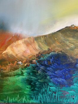 Ein neues, fröhliches Bild der einzigartigen Natur, die der Künstler in Island sah. Letztes Jahr verbrachte Ludmila einen ganzen Monat in einer kreativen Residenz, was sie zu neuen Themen in ihrer Arbeit inspirierte: Berge, Vulkane und Geysire. So sah sie die farbigen Berge in diesem wunderschönen Winkel der Erde.