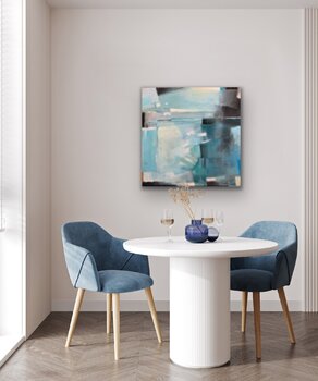 „Showers at the Lake“ ist ein gegenstandsloses abstraktes Gemälde, das während eines Frühlingsregens in Südkalifornien entstand. An solchen Tagen bin ich gern in meinem Atelier. Ich hoffe, Ihnen gefällt die lockere Anwendung von Blautönen und schwarzen Linien, die Ihren Blick hin und her bewegen. Schauen Sie genau hin, um die Wassertropfen und herabtropfenden Regentropfen zu sehen. „Showers Before the Storm“ lässt sich zu einem vereinenden Diptychon… zusammenfügen. Diese könnten Ihnen gehören und Sie in Ihrem Zuhause oder Büro erfreuen.