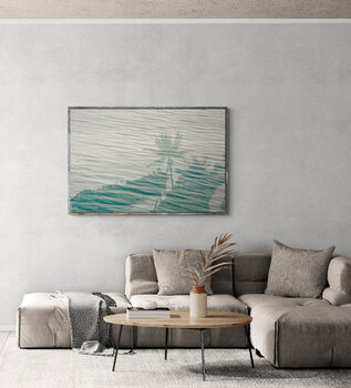 Hier vermischen sich Sand und Palmen mit der Bewegung der Wellen und überlappen sich, wodurch malerische Texturen und Schatten mit einem sehr organischen Gefühl entstehen.
