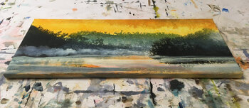 In dieser Arbeit habe ich versucht, die vergängliche Essenz einer Winterdämmerung einzufangen. Die mit der Collage vermischte Tinte erzeugt tiefe Texturen und Reflexionen auf dem See, die Ruhe und Geheimnis suggerieren. Abstraktion lädt zum Nachdenken ein. Es ist eine Einladung zum Tagträumen und dazu, die Gedanken über das Sichtbare hinaus schweifen zu lassen. Es verleiht jedem Interieur einen Hauch von Gelassenheit und Poesie.