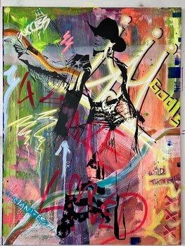 Dieses einzigartige Kunstwerk verkörpert eine kraftvolle Symbiose aus urbaner Streetart, abstraktem Expressionismus und Pop-Art-Einflüssen. Der dynamische Hintergrund pulsiert vor Energie - leuchtende Farben, neonartige Lichteffekte und expressive Pinselstriche erzeugen eine vibrierende Bewegung, die sofort ins Auge springt.