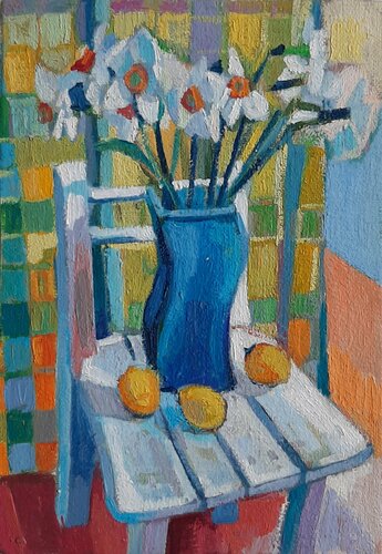 In diesem Werk habe ich lebendige Energie in das Zusammenspiel von Licht und Farbe gesteckt und mit impressionistischen Strichen schlichte Schönheit zelebriert. Die blaue Vase und die lebendigen Blumen kontrastieren mit dem gemusterten Hintergrund und vermitteln Wärme und Ruhe. Dieses Gemälde lädt zu Freude und Ruhe ein und erfüllt Ihren Raum mit einer erhebenden, herzlichen Umarmung alltäglicher Eleganz.