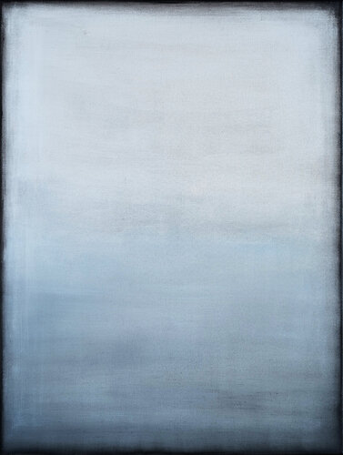 Das Gemälde besticht durch eine subtile Farbpalette aus kühlen Blau- und hellgrauen Tönen und schafft so eine ruhige, fast meditative Atmosphäre. Zarte Tonwertübergänge deuten die Horizontlinie an, stellen sie aber nicht wörtlich dar. Sanft gestreutes Licht scheint die Leinwand zu durchdringen und verleiht dem Bild Tiefe und Weite.