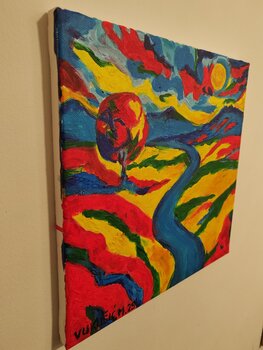 In diesem Werk folgte ich meiner Intuition und ließ Farbe und Bewegung die Komposition bestimmen. Durch kühne, ausdrucksstarke Pinselstriche und lebendige Kontraste schuf ich eine Landschaft, die sich lebendig anfühlt – fast in Bewegung.