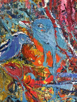 Das Gemälde *Vögel der Gefühle* ist ein Werk voller Symbiose und zugleich Ausdruck von Gedanken und der Kraft der Fantasie. Es ist Ausdruck und Symbol des Lebensweges, der reich an Emotionen, vielschichtig, schön und geheimnisvoll ist. Jeder Vogel erzählt bildlich von einem Gemütszustand und Gefühl, eine Illustration des Inneren.