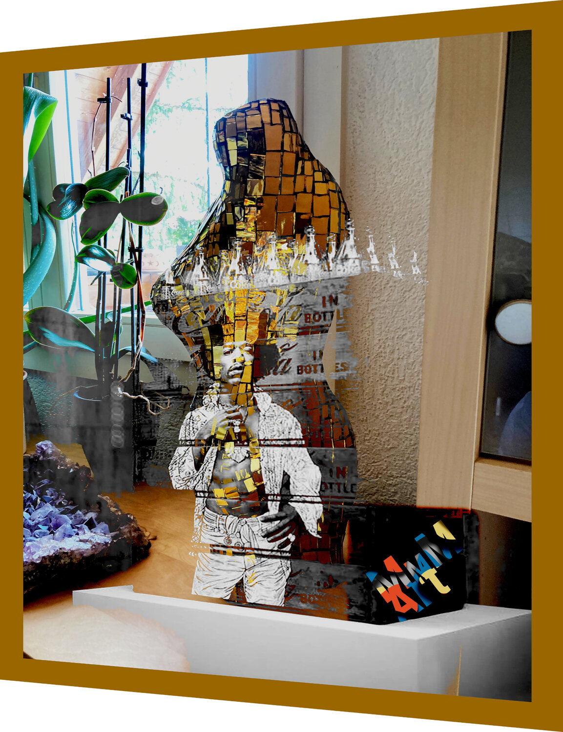 "Hendrix-Coke-Sculpture" ist ein zusammengesetztes Foto von Jimmy Hendrix (schwarz-weiss), auf dem er in den 60er Jahren für Coca-Cola wirbt und einem Foto der Skulptur "golden Torso", die von der Künstlerin Manuella Muerner Marioni kreiert wurde. Die Skulptur wurde am Broadway in New York ausgestellt und verbindet Amerika mit Coca-Cola und Hendrix. Nun sind sie vereint und bilden zusammen ein Gefühl von Freiheit, Rock und Abenteuer. Die Skulptur… mit Spectrum-Glasplättchen ist auch auf Singulart erhältlich.