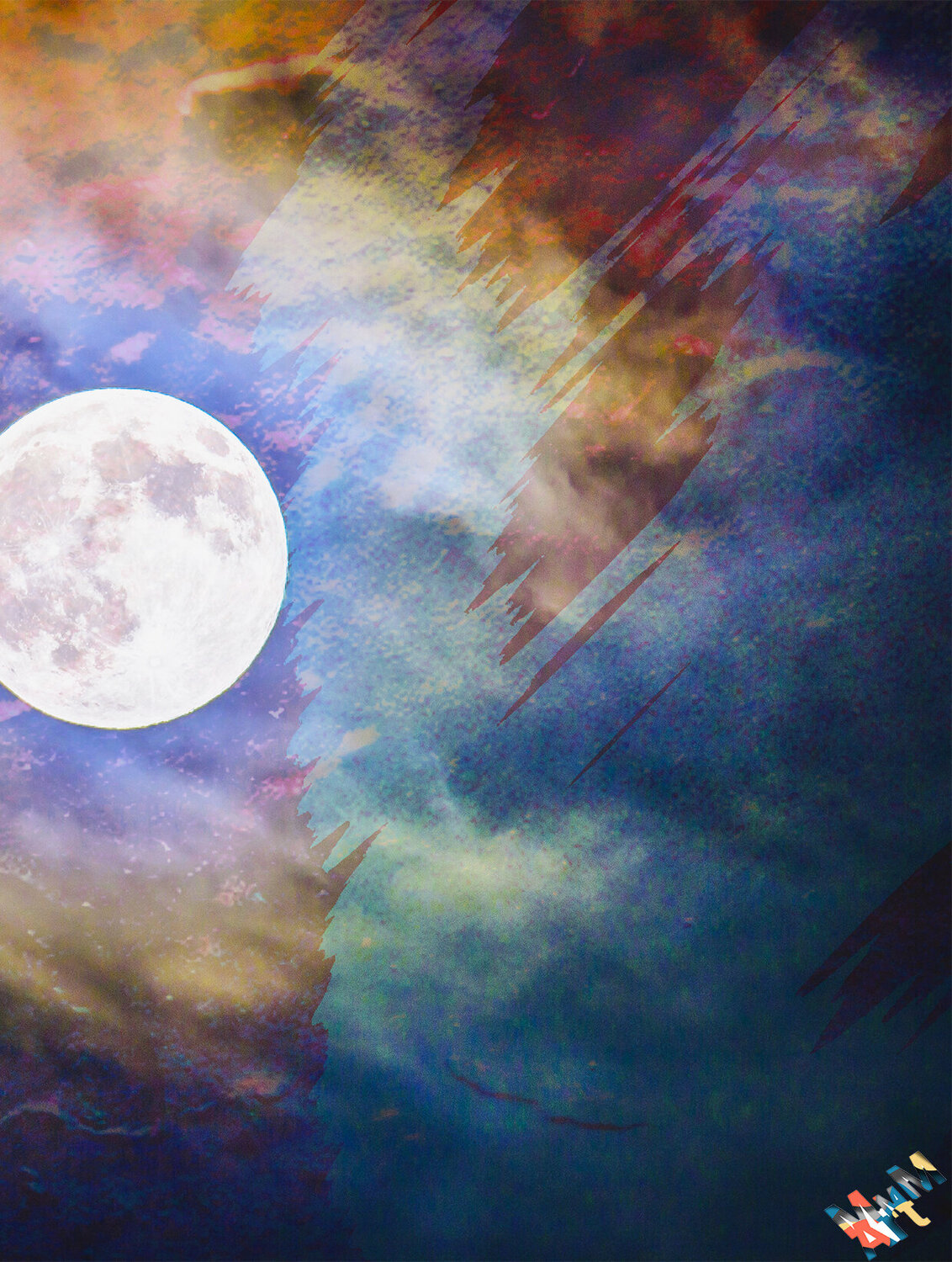 Der "Mondhimmel" ist ein Lieblingswerk der Künstlerin Manuella Muerner Marioni. Der Mond mit seinen Zyklen hat die Künstlerin schon immer fasziniert und mit Begeisterung verfolgt sie das uralte Wissen der verschiedenen Mondphasen in der Astrologie mit den vier verschiedenen Elementen. Im Wandel der Mondphasen wird die irdische Nacht sehr unterschiedlich aufgehellt, und die Astronomen müssen bei Beobachtungen mit optischen Teleskopen die hellen „Mondnächte“… rund um Vollmond meist aussparen. So ist das Bild "Mondhimmel" mit vier verschieden Ebenen aufgebaut, die auf die eigentliche Fotografie zusätzlich eingeblendet wurden. Eine zauberhafte Wirkung verursacht die Tiefe in die Unendlichkeit des Bildes.