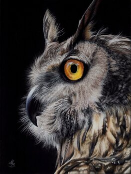 'Wächter der Nacht' ist ein tiefgründiges Porträt der majestätischen Eule, das ihre zeitlose Weisheit und ihren scharfen Blick einfängt. Mit diesem handgezeichneten Original habe ich versucht, die Details ihrer Federstruktur und die leuchtende Intensität ihrer Augen zum Leben zu erwecken.