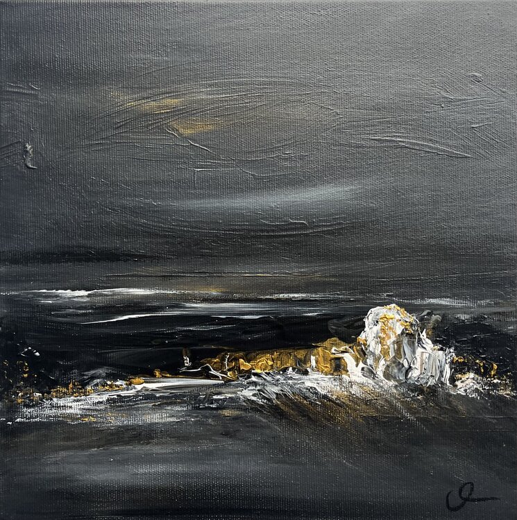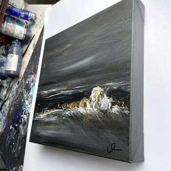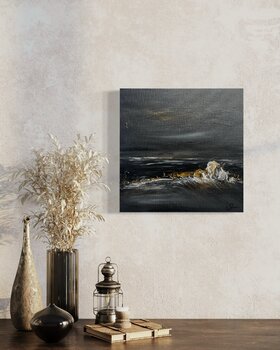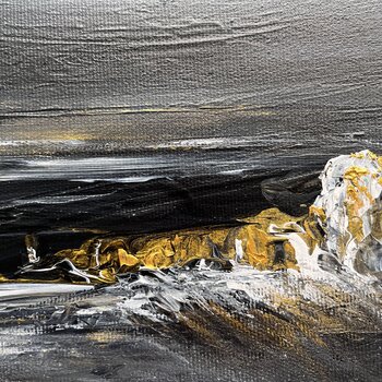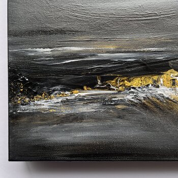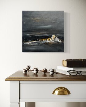 In dieser Arbeit verwendet die Künstlerin, Maria Bevilacqua-Fischer Acrylfarben, um eine Szenerie zu kreieren, die sowohl abstrakt minimalistisch als auch impressionistisch ist. Durch die gestische Pinselführung und die Kontraste zwischen geheimnisvollen, dunklen Farbtönen und strahlenden Goldelementen fängt sie auf unvergleichliche Weise die dynamische Energie und emotionale Tiefe der Natur ein.