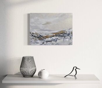 In ihrer Arbeit verbindet die Künstlerin, Maria Bevilacqua-Fischer, abstrakte Impressionen mit minimalem Symbolismus, wobei sie Acrylfarben und Blattgold verwendet. Die sanften Grau- und Weißtöne schaffen eine beruhigende Atmosphäre, während die goldenen Akzente Dynamik und Raffinesse einbringen.