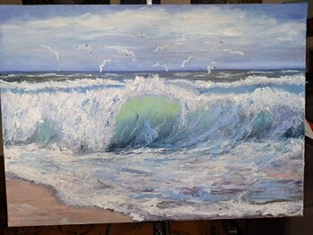 Die mit lebendigen und dynamischen Pinselstrichen gemalten Wellen scheinen auf der Leinwand zum Leben zu erwachen, prasseln und spritzen vor Energie. Die Blau-, Weiß- und Grüntöne vermischen sich… harmonisch und erschaffen die hypnotische Schönheit des bewegten Meeres.