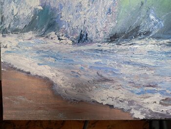 Der Himmel über dem Meer, reich an Farben und Texturen, verleiht der Szene Tiefe und Dramatik und schafft eine Atmosphäre des Friedens und der natürlichen Kraft. Das auf dem Wellenkamm eingefangene Licht spiegelt die Fähigkeit des Künstlers wider, das Lichtspiel auf dem Wasser nachzubilden.