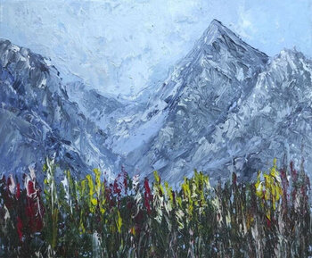 In der Bildmitte erstreckt sich das Tal mit einer Palette blühender Blumen. Gänseblümchen, Mohn, Lavendel… und viele andere Blumenarten folgen einander in einer Fülle von Farben und Düften. Die Blumen scheinen fast miteinander zu kommunizieren und erzeugen so einen Effekt berührender Harmonie. Zwei hoch aufragende Berge ragen als Wächter der Landschaft hervor und ihre schneebedeckten Gipfel ragen bis zum Horizont empor.