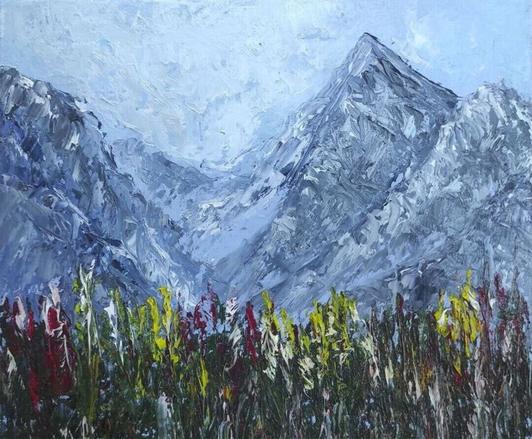 Das Gemälde „Tal der Blumen“ ist ein Eintauchen in die unberührte Schönheit der Natur, interpretiert mit impressionistischer Kunst. Dieses Gemälde fängt die Majestät der Berge ein, die ein üppiges Tal umgeben, geschmückt mit einer Vielzahl von Blumen im Vordergrund.