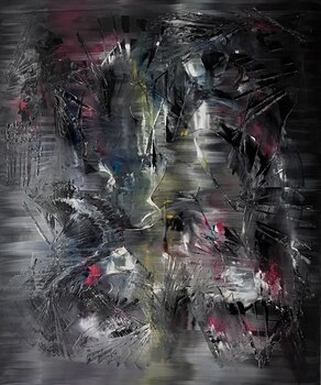 „Verborgene Gesichter IV“, Teil der eindrucksvollen Serie „Les Messagères“, ist ein markantes Beispiel abstrakten Expressionismus, charakterisiert durch sein dynamisches Zusammenspiel von Farbe und Form. Das Werk fesselt durch die Verwendung tiefer, melancholischer Farbtöne – vorwiegend Schwarz, Grau und Silber –, durchsetzt mit scharfen roten Akzenten und Spuren von Blau und Gelb. Die Komposition ist ein komplexes Geflecht aus chaotischen, zackigen… Linien und wirbelnden Pinselstrichen, das inmitten der Unordnung ein Gefühl von Bewegung und Fluidität erzeugt. Ein einzigartiger Aspekt dieses Werkes ist seine Textur. Chéreau verwendet verschiedene Techniken, um Tiefe und Dimension zu schaffen, indem er Farbschichten aufträgt und so eine haptische Oberfläche erzeugt. Die Textur variiert von glatten, verschwommenen Abschnitten bis hin zu Stellen, an denen die Farbe von der Leinwand zu springen scheint und so eine dreidimensionale Wirkung erzielt. Dieses Werk fordert den Betrachter heraus, hinter das Chaos zu blicken und den wilden und weisen Geist zu entdecken, der in uns allen schlummert.